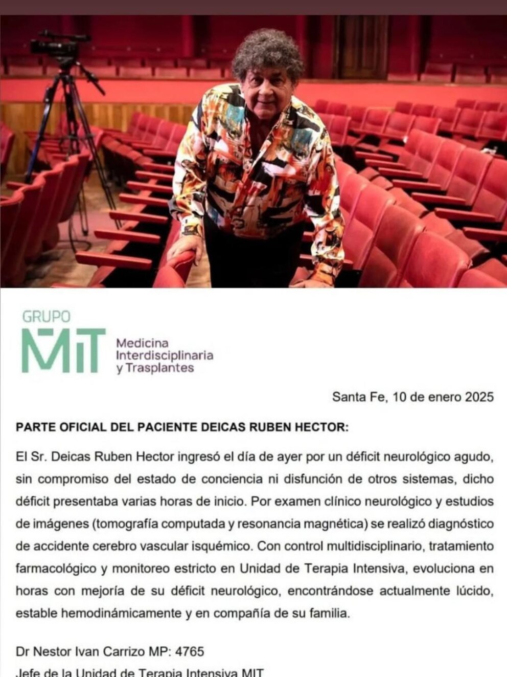 Cerca del mediodía, Crónica replicó el parte médico del sanatorio con fecha del 10 de enero: “El paciente Deicas Rubén Héctor ingresó el día de ayer por un déficit neurológico agudo, sin compromiso del estado de conciencia ni disfunción de otros sistemas. Dicho déficit presentaba varias horas de inicio. Por examen clínico neurológico y estudios de imágenes (tomografía computada y resonancia magnética) se realizó diagnóstico de accidente cerebro vascular isquémico. Con control multidisciplinario, tratamiento farmacológico y monitoreo estricto en Unidad de Terapia Intensiva, evoluciona en horas con mejoría de su déficit neurológico, encontrándose actualmente lúcido, estable hemodinámicamente y en compañía de su familia”.