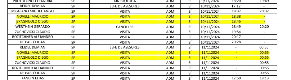 - El 10 de noviembre fue otro domingo nocturno con Spagnuolo y los amigos habituales pero con un invitado especial: Mauricio Novelli, uno de los hombres clave en la estafa Libra. Todos llegaron antes de las 19 y se fueron casi a la 1 de la mañana. En el medio Milei recibió también al canciller Gerardo Werthein.