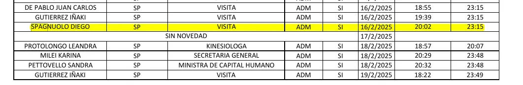 - El 16 de mayo Spagnulo visitó a Milei a solas en el chalet presidencial. Fue breve, de 11.47 a las 12.08. La otra visita del día fue Patricia Bullrich, que pasó a la mañana. Pocos van al chalet.