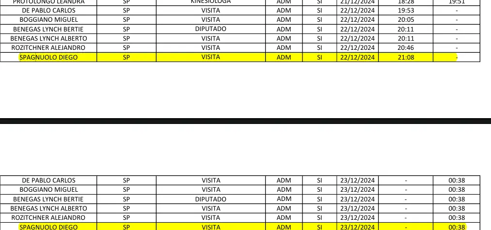 - El 9 de junio de 2024 Spagnulo tuvo otro encuentro con el grupo de amigos nocturno. Llegó a las 20.11 y se fue a la 1.05 de la madrugada. Estuvieron Miguel Boggiano y Juan Carlos De Pablo. Era domingo.