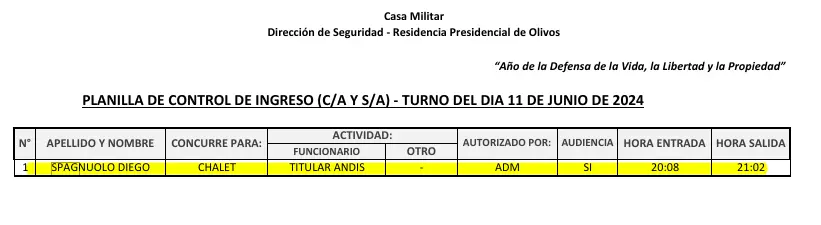 - El 11 de junio de 2024 Spagnulo fue de noche al chalet presidencial. Estuvo con Milei una hora. Era martes.