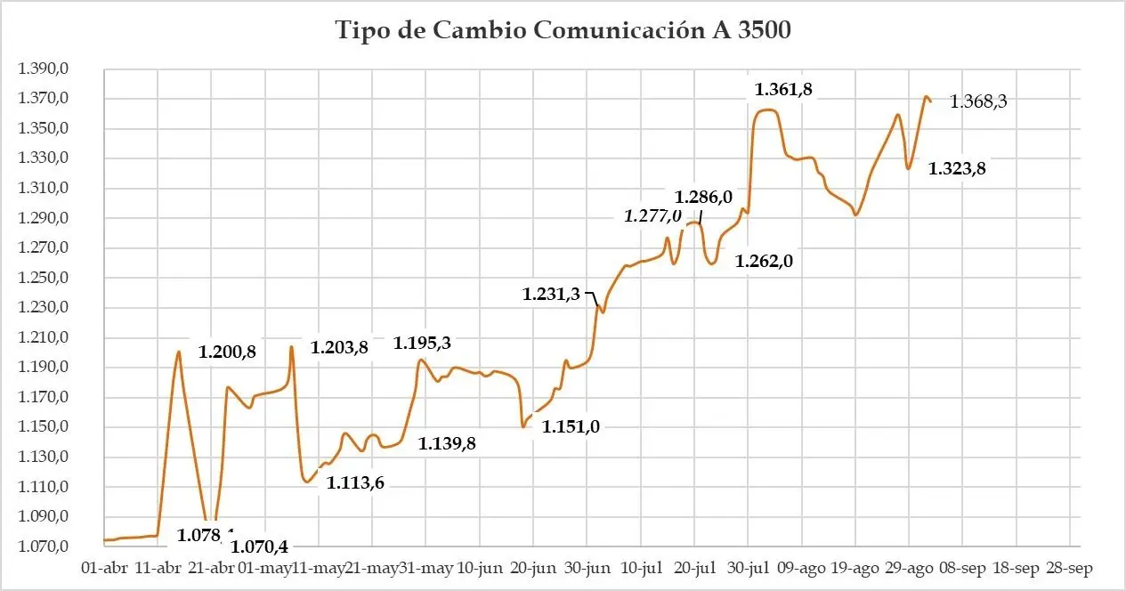 La mesa de dinero del Banco Central se encargó de operar este martes contra la cuenta en dólares del Tesoro, que según el último dato disponible al 29 de agosto tenía un saldo de 1.686 millones de dólares, y para saber el volumen de intervención habrá que esperar tres días hábiles que tienen de retraso las estadísticas.