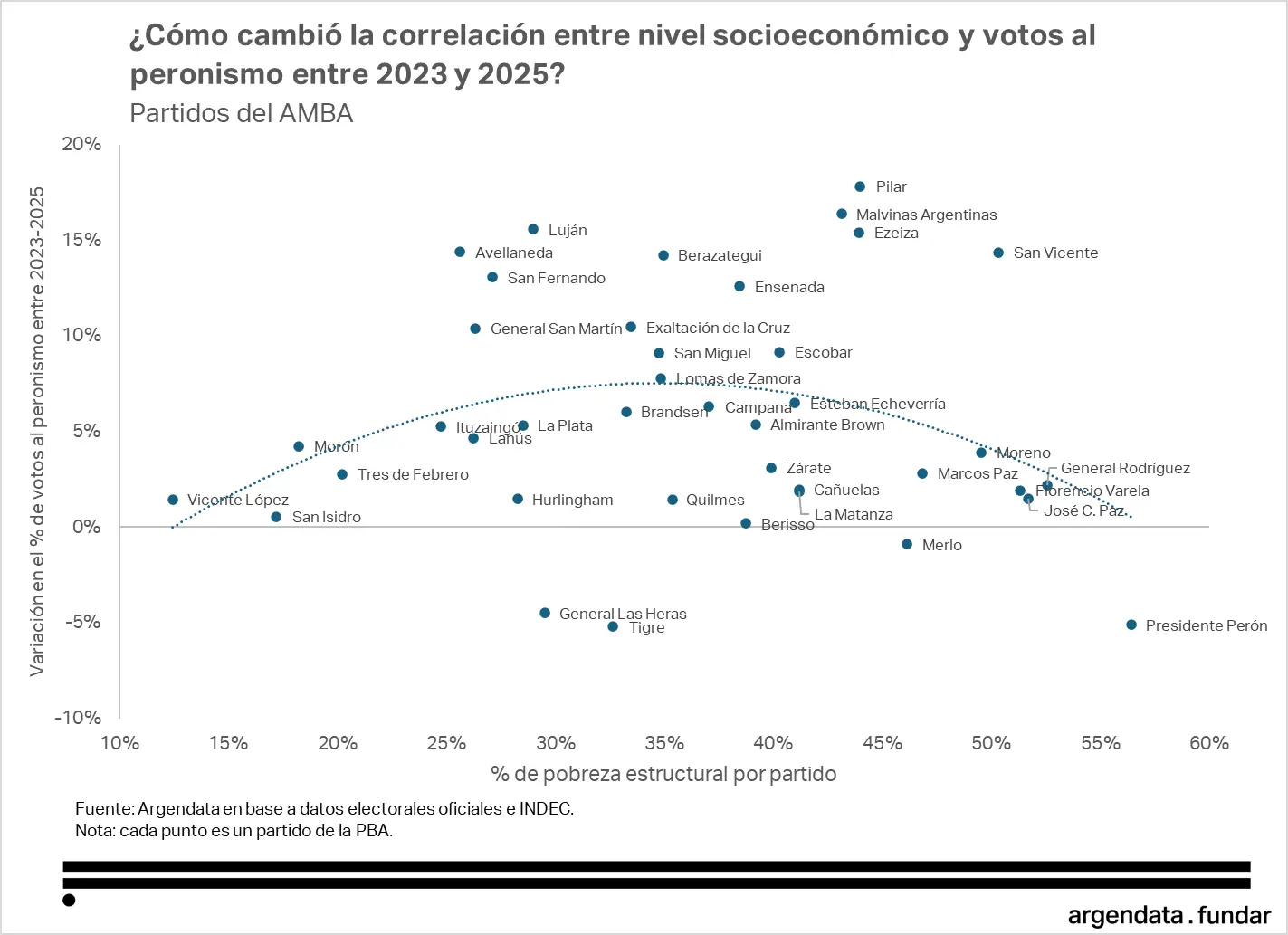 La contracción económica y el deterioro salarial son muestras de la crisis en curso y se expresan en una realidad concreta: el shock económico no solo afectó a los sectores bajos, sino que deterioró en gran medida las condiciones de vida de los sectores de nivel socioeconómico medio. Y esa realidad cotidiana parece haber tenido un correlato directo en el voto de las recientes elecciones bonaerenses. En lo concreto, donde más creció el peronismo en porcentaje de votos entre 2023 y 2025 fue, justamente, en partidos de nivel medio. “Tanto en el AMBA como por fuera, se observa el mismo patrón, donde más creció el peronismo es en municipios de nivel socioeconómico medio”, según un relevamiento del economista Daniel Schteingart de Argendata.