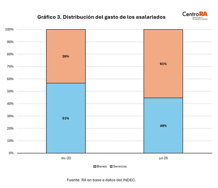 Antes del inicio del gobierno de Milei, los asalariados destinaban poco más de la mitad de sus ingresos a la compra de bienes; sin embargo, ahora más del 60% de los ingresos se destina al pago de servicios, según un informe del Centro para la Recuperación Argentina (RA) de la UBA.
