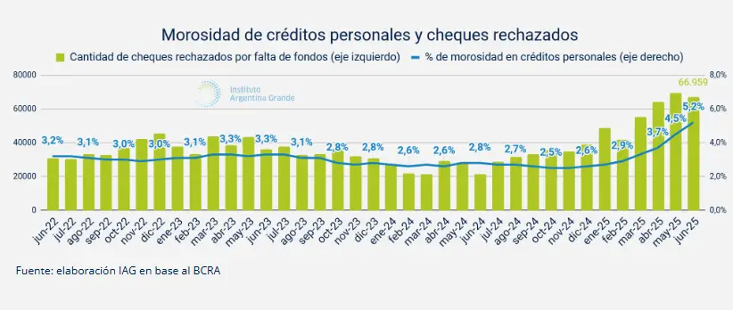 De hecho, un dato para nada menor tiene que ver con la morosidad récord. La irregularidad en los pagos de créditos a familias alcanzó el 5,2%. Se trata de la cifra más alta en 16 años, acumulando 7 meses consecutivos de aumento, según consignó un informe del Instituto Argentina Grande (IAG).