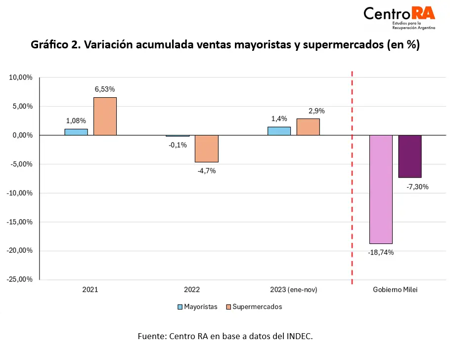 Lo anterior explica también por qué transcurridos 29 meses del inicio de la gestión libertaria, el nivel de ventas tanto en mayoristas como en supermercados no logró todavía recuperar los valores de comienzos del mandato. Si bien se registra un crecimiento sostenido de las ventas en supermercados durante los últimos meses no fue suficiente para compensar la caída acumulada previamente (cerca de 10% desde inicios del gobierno) y generó que la caída acumulada en las ventas de supermercados durante la gestión sea cercana al 7%, según el Centro RA -UBA. Por su lado, las ventas mayoristas profundizaron su retroceso, acumulando una contracción cercana al 19%.