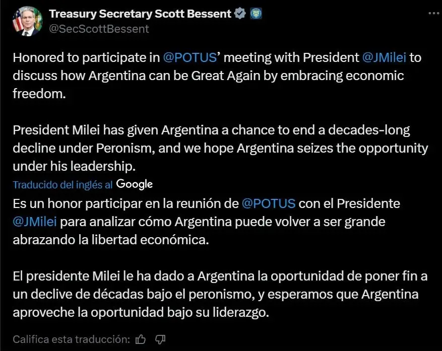 Bessent y Caputo declararon que seguirá la banda cambiaria, pero no indicaron cuáles serán los respectivos piso y techo, y cómo será la posterior evolución de ambas cotizaciones.