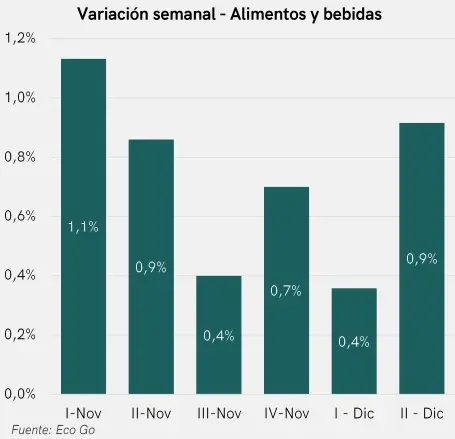 Con este comportamiento, los precios de los alimentos proyectan un incremento cercano al 2,5% para todo diciembre. Si se suman los consumos fuera del hogar, el índice general de alimentos se ubica en torno al 2,4%, un nivel que vuelve a colocar a este rubro por encima del promedio de la inflación mensual estimada.