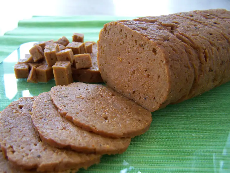 Una vez pasado el tiempo de cocción, retirar del fuego, sacar el film y dejar entibiar. Luego cortar el seitán -así se le llama a la masa de gluten- en lonjas.