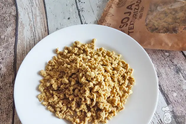 - Hidratar la soja texturizada cubriéndola por completo con agua hasta que duplique su tamaño.