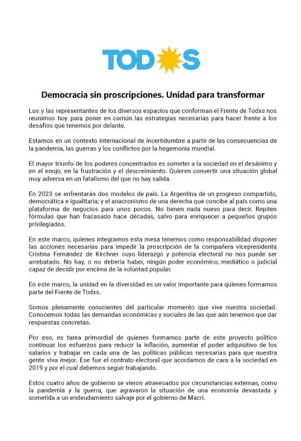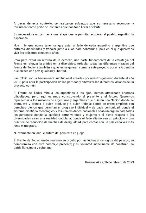El texto también dedica varias líneas a la importancia de las PASO como una herramienta "para abrir la participación de los partidos y sintetizar las diferentes visiones de un proyecto común". Luego de hacer un repaso por las situaciones externas a las que se vio expuesta la gestión del Frente de Todos (pandemia y guerra), el documento resalta el valor de la unidad y sostiene: "La unidad en la diversidad es un valor importante para quienes formamos parte del Frente de Todxs".