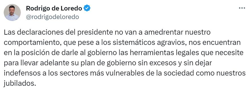 “Las declaraciones del Presidente no van a amedrentar nuestro comportamiento, que pese a los sistemáticos agravios, nos encuentran en la posición de darle al Gobierno las herramientas legales que necesite para llevar adelante su plan de gobierno sin excesos y sin dejar indefensos a los sectores más vulnerables de la sociedad, como nuestros jubilados”, señaló.